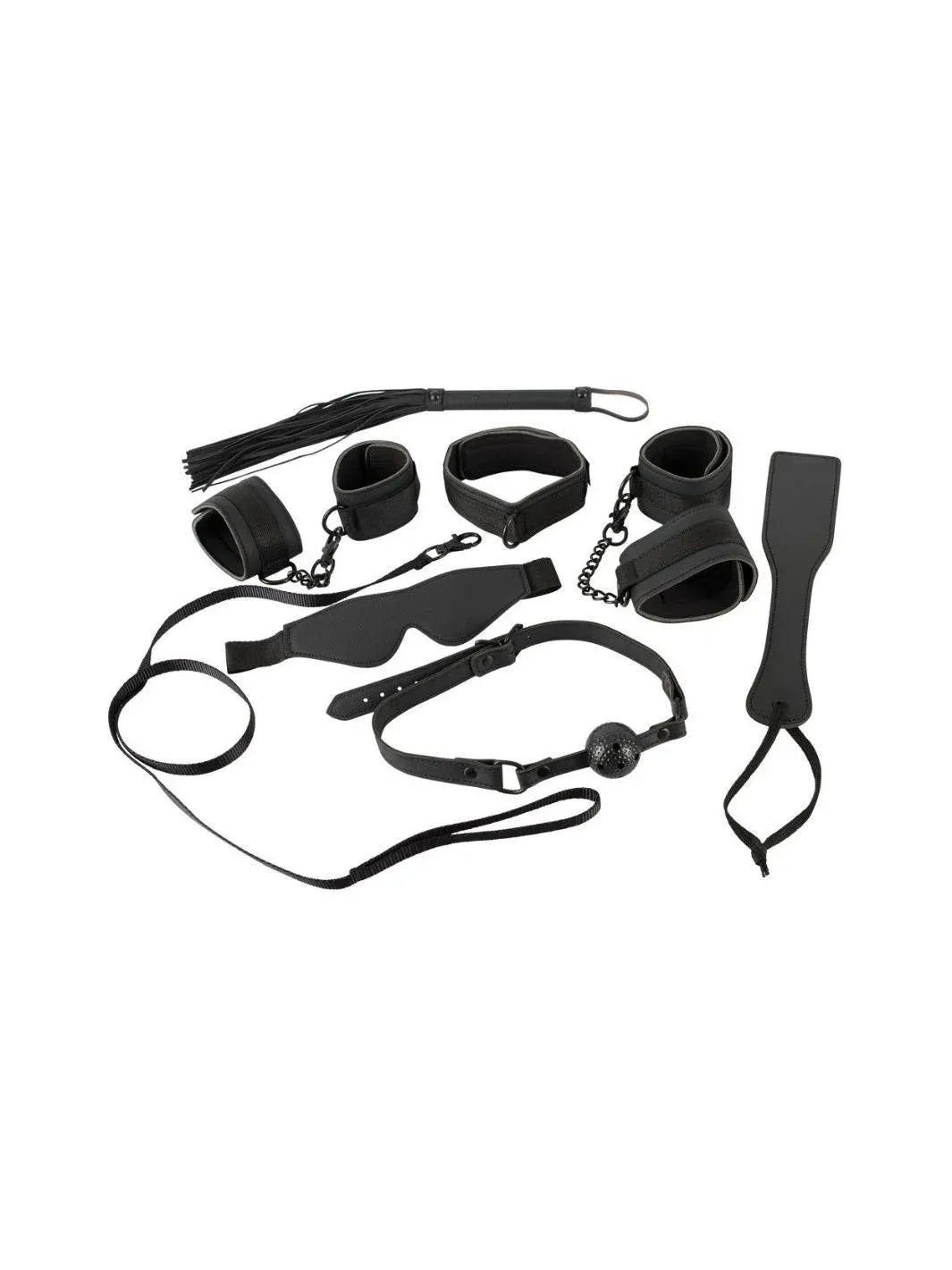 Riem 1 m, gag Ø 3,5 cm, flogger 38 cm, paddle 27 cm.