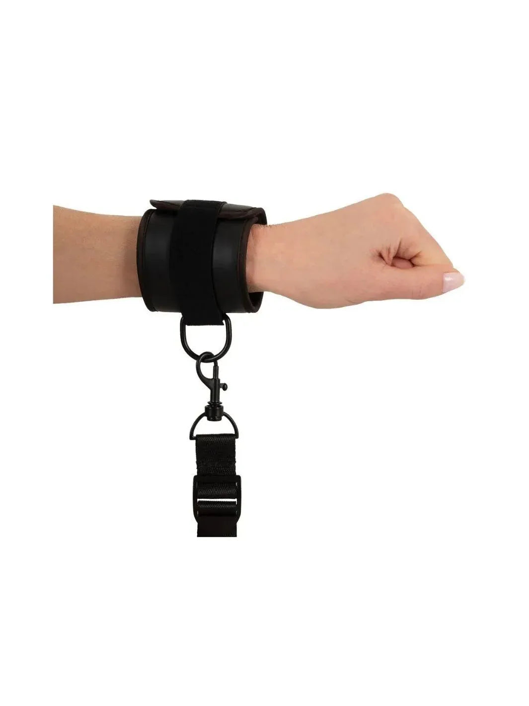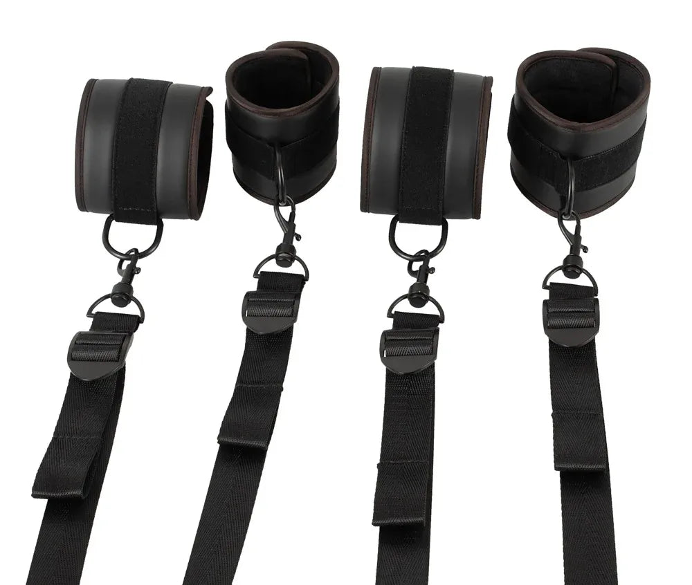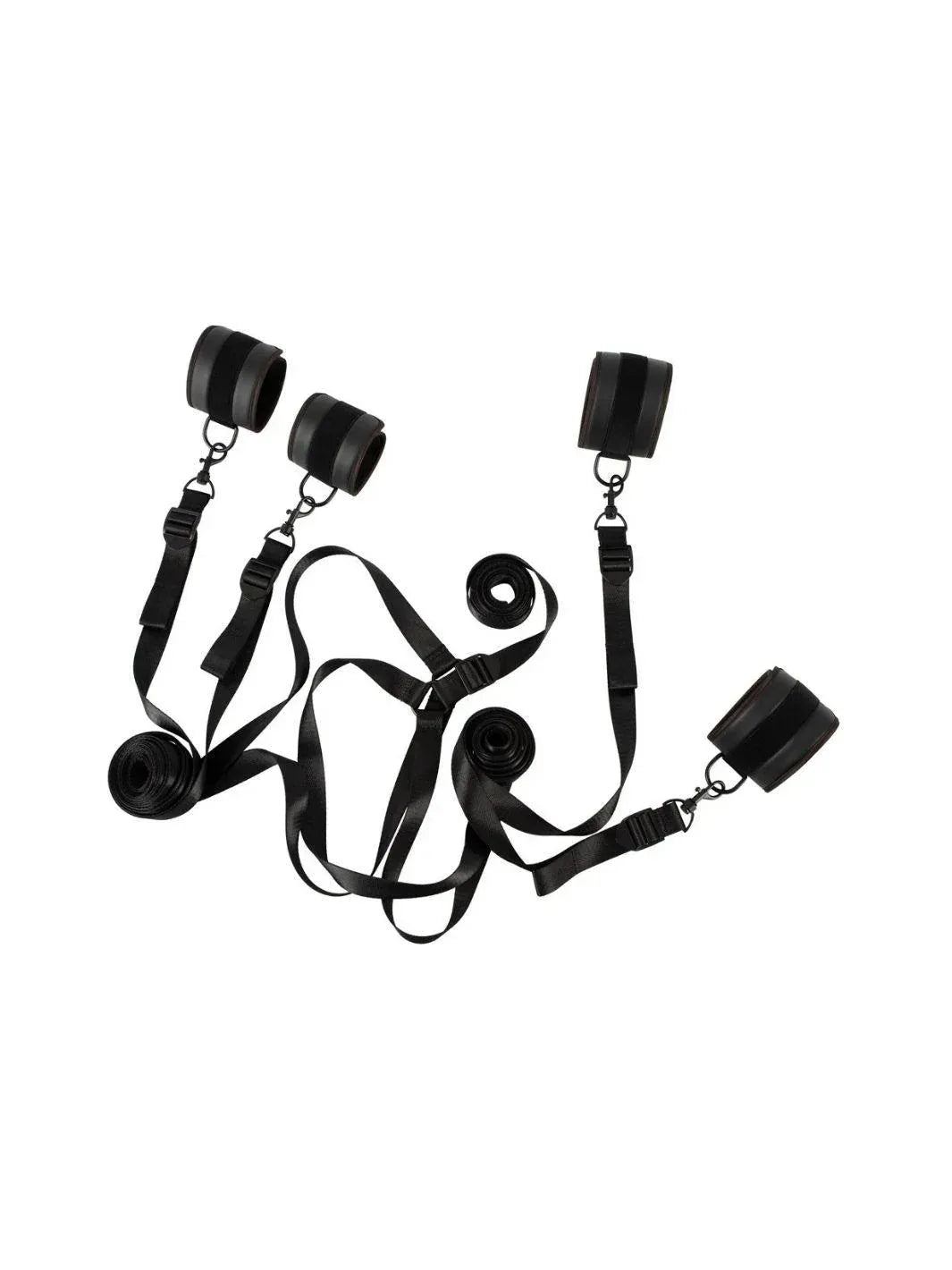 Met deze bedboeienset kan elk bed in een professionele bondage-playground worden veranderd. Het kruis van verstelbare, scheurvaste banden past onder elk matras. De handboeien en enkelboeien kunnen aan de banden worden bevestigd omdat er aan het uiteinde van elke band een karabijnhaak zit. De comfortabele handboeien en enkelboeien hebben een typische lederen look (maar alles is volledig vegan!). Ze hebben klittenbandsluitingen waardoor ze geschikt zijn voor zowel hem als haar.