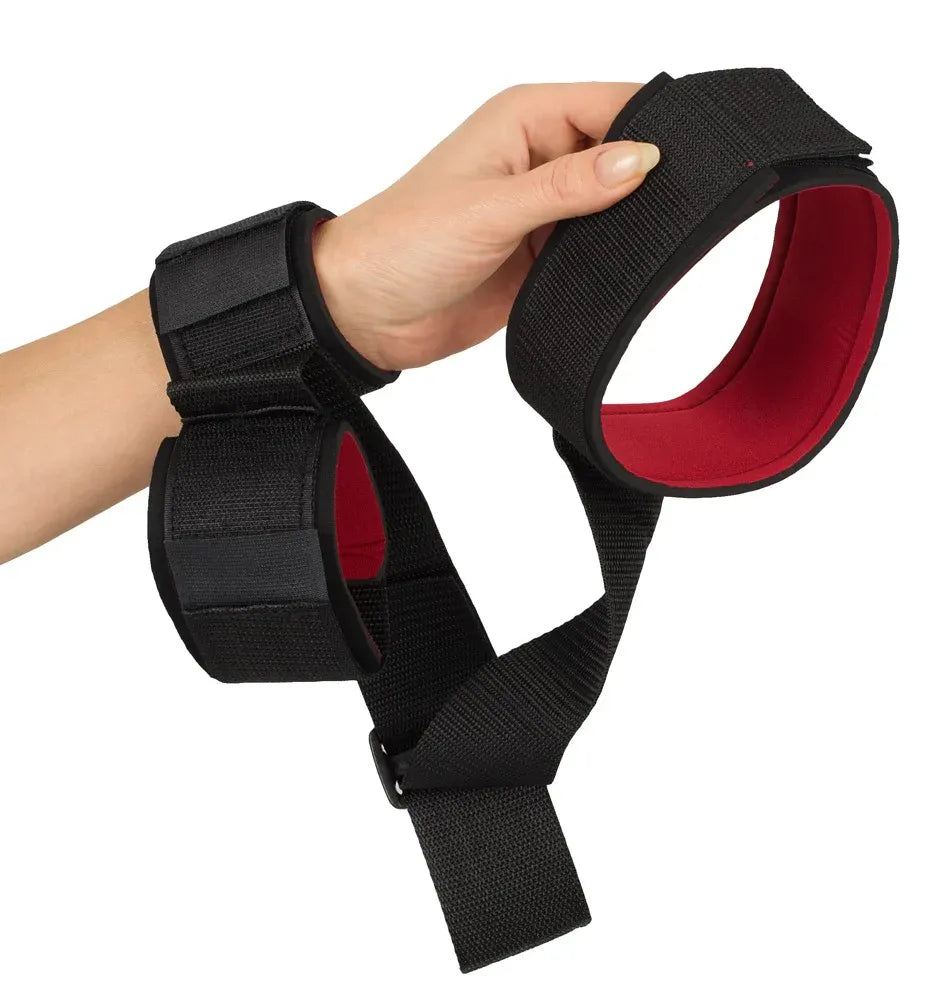 Gecombineerde hals- en handboeienset. Zacht gevoerd en individueel verstelbaar dankzij klittenbandsluitingen. Gemaakt van scheurvast synthetisch vezel.