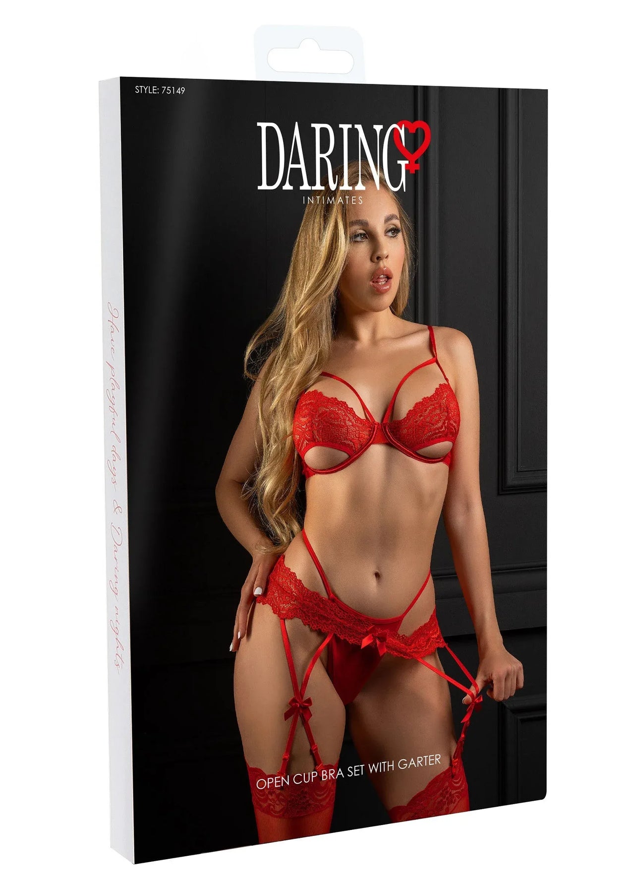 Verhef je meest intieme momenten met Daring Intimates' verleidelijke Open Cup BH-set met Jarretel. Omarm de aantrekkingskracht van onweerstaanbare jarretels, versierd met plagend charmante strikken. De haak-en-oogsluiting, verstelbare bandjes en beugelcups zorgen voor een onberispelijke pasvorm. Vervaardigd uit delicaat zacht kant, biedt dit stuk een zinnig genot dat elke sensatie versterkt. Kousen zijn niet inbegrepen. Ontdek de perfecte balans tussen comfort en verleiding voor onvergetelijke momenten.