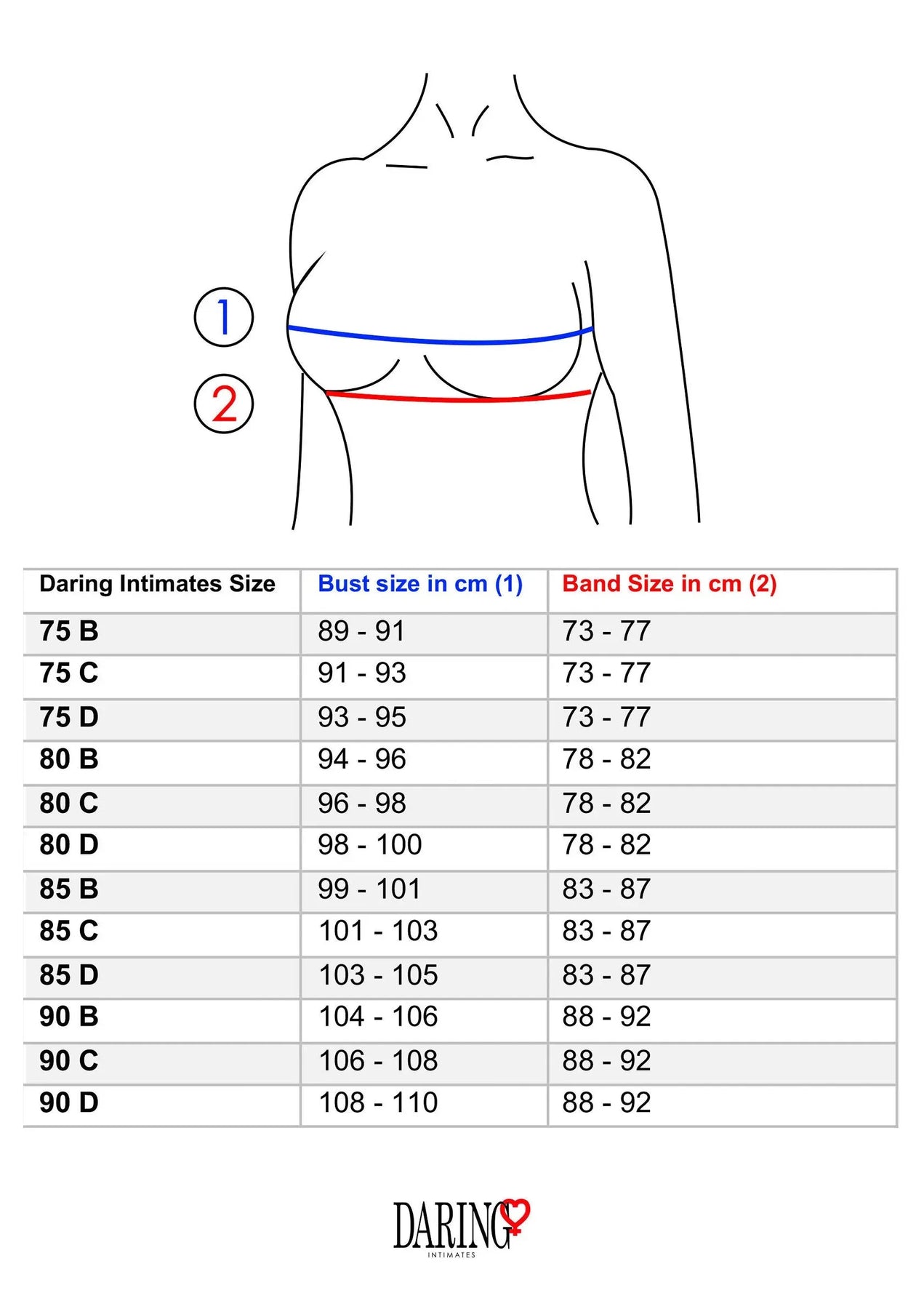 Begin met de onderborstomtrek en bepaal daarmee de beha-maat. Meet daarna de borstomtrek en bereken het verschil om de cup te vinden.