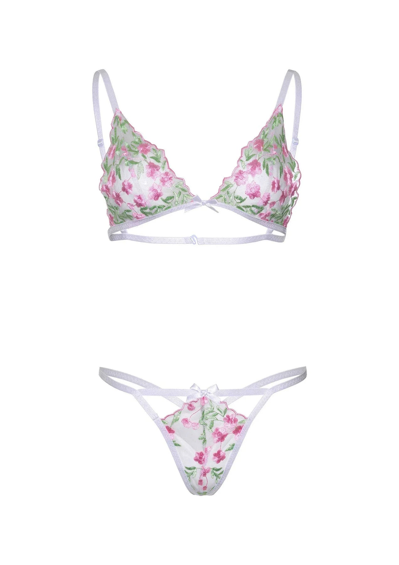 2 delige set bestaat uit een transparante BHen string met bloemenborduursel.