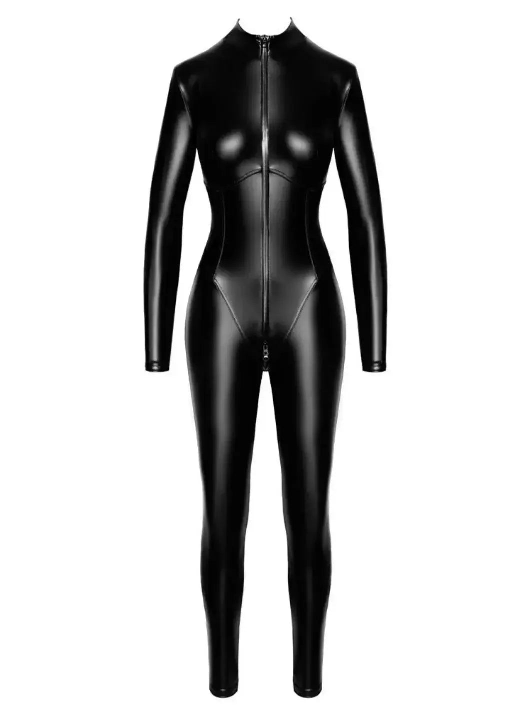 Noir Handmade Catsuit Orgia Chimera Wetlook Zwart met rits hoge hals is een echte blikvanger voor liefhebbers van wetlook catsuit, powerwetlook, rits. Het materiaal sluit nauw aan en voelt zacht en rekbaar aan, zodat je de look lang kunt dragen. De hoge hals benadrukt een krachtige fetish uitstraling.