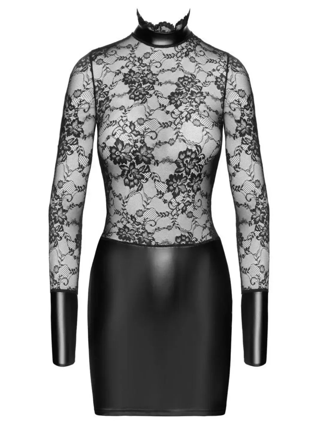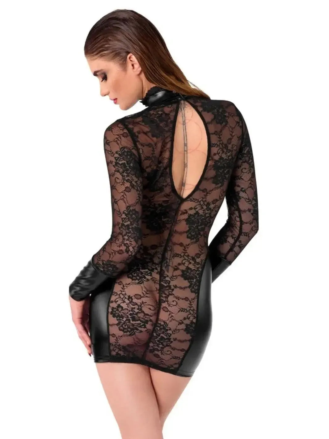 Noir Handmade Sexy Wetlook en kant cocktail jurk hoge hals mesh is een echte blikvanger voor liefhebbers van wetlook jurk, powerwetlook, kant. Het materiaal sluit nauw aan en voelt zacht en rekbaar aan, zodat je de look lang kunt dragen. De hoge hals benadrukt een krachtige fetish uitstraling.