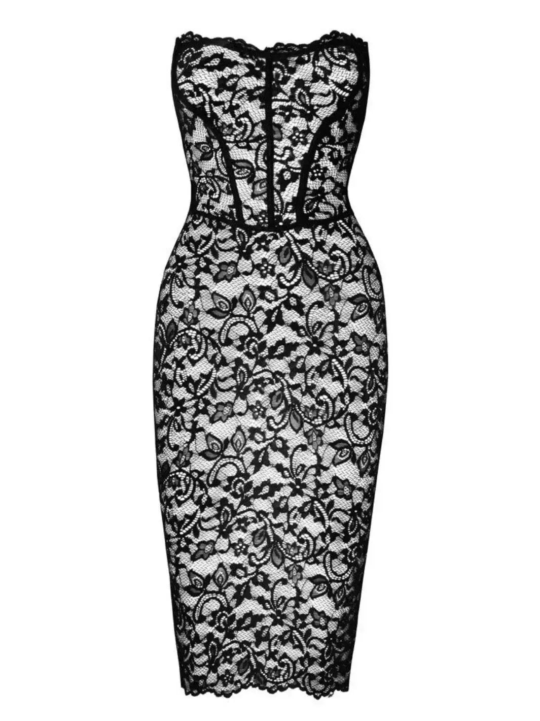 Noir Handmade Strapless Doorschijnende Jurk NOIR veters kant is een echte blikvanger voor liefhebbers van wetlook jurk, kant, veters. Het materiaal sluit nauw aan en voelt zacht en rekbaar aan, zodat je de look lang kunt dragen. Vetersluiting zorgt voor een speelse afwerking en extra verstelbaarheid.