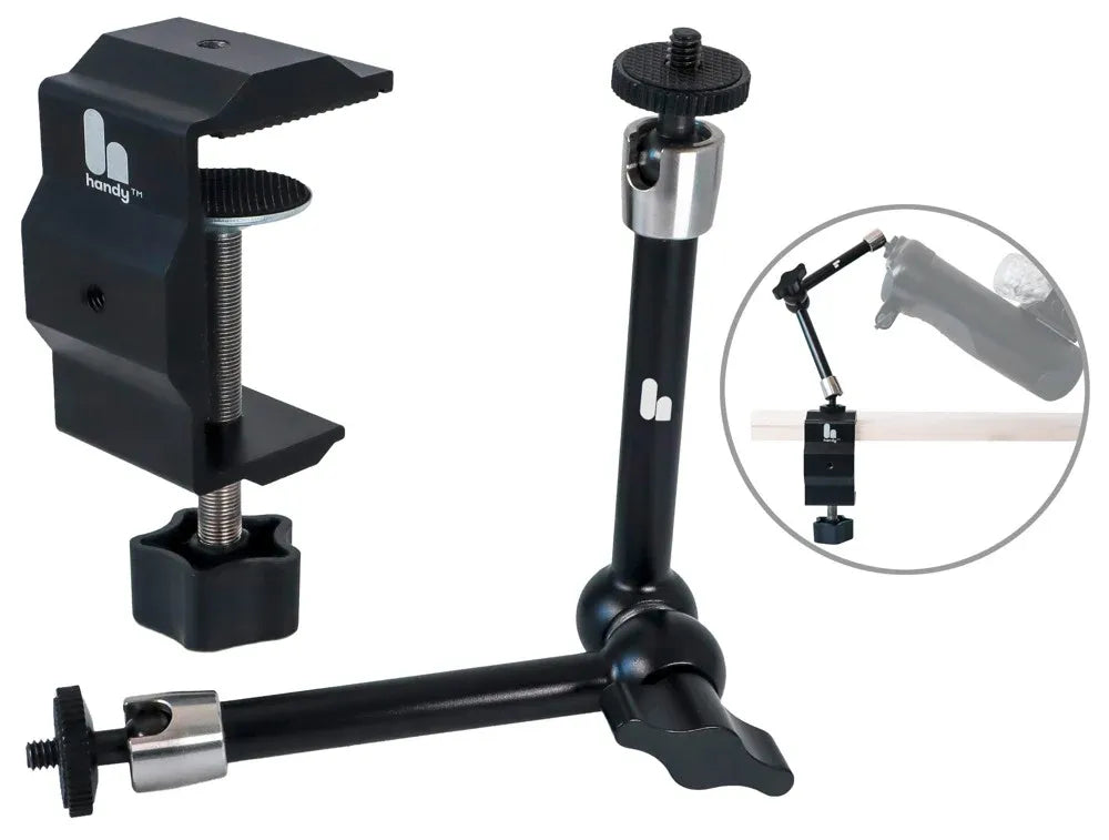HandsFree bureauhouder: 11 x 6 x 4,5 cm. Scharnierende armen van elk 13 cm lang, 2,5 cm breed. Aluminium, roestvrij staal, rubber.