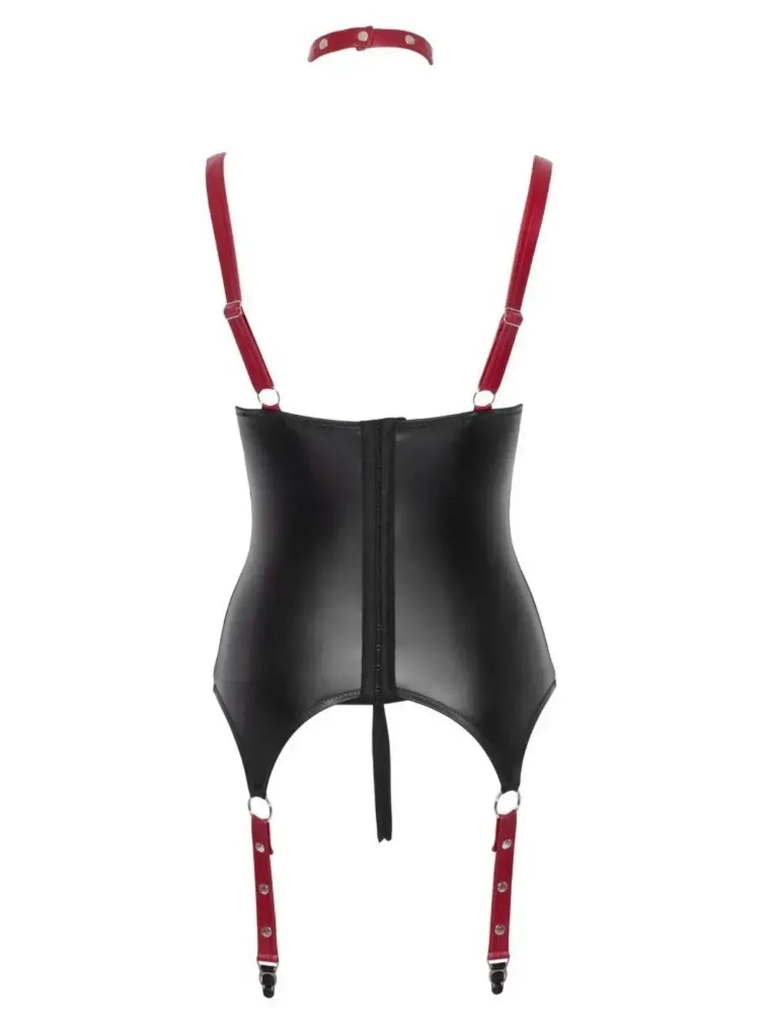 - Wetlook basque in zwart en rood met bondage details en ringaccenten